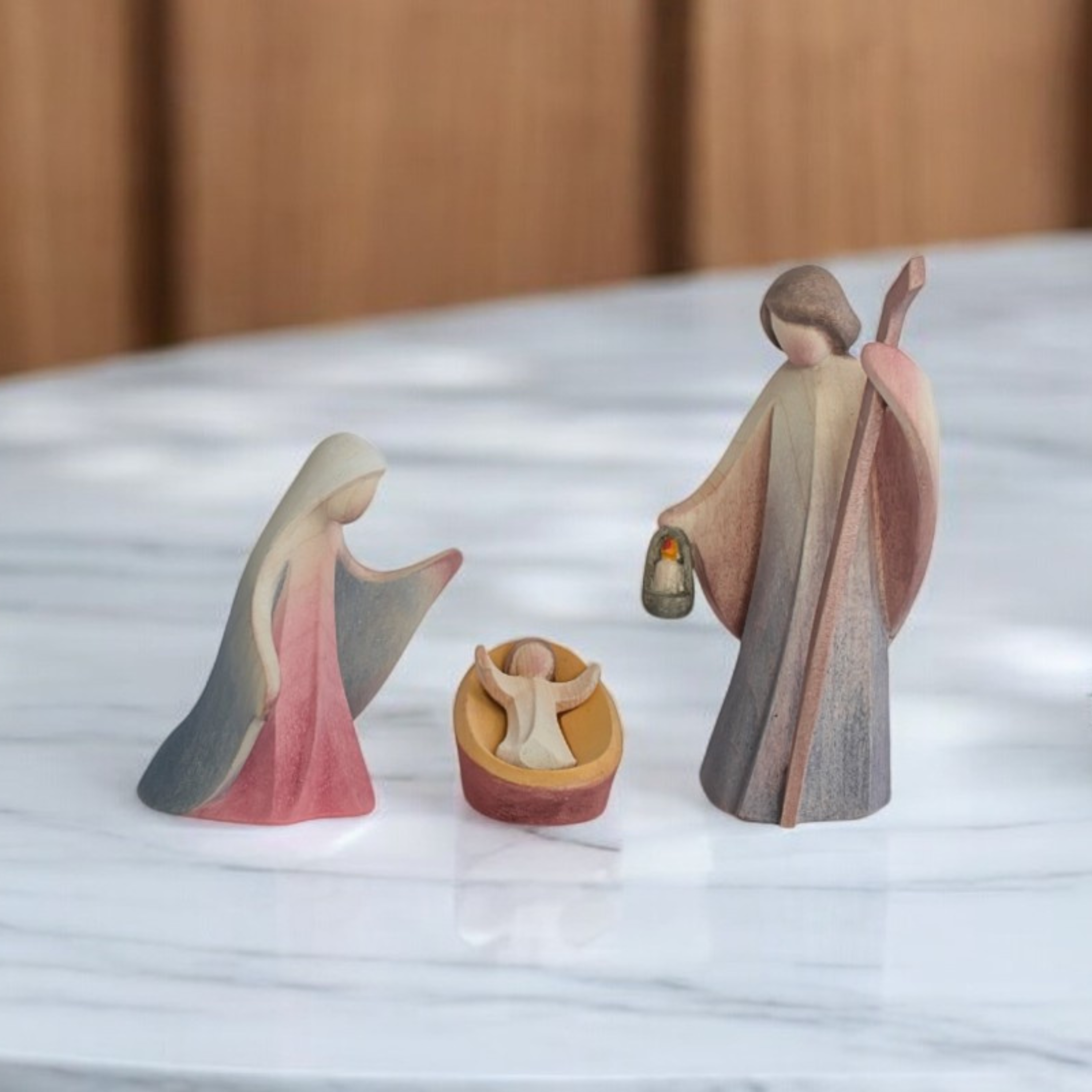 Geschnitzte Pema Krippenfiguren in modernem Stil. Eine moderne Weihnachtskrippe mit traditionellen südtiroler Elementen.